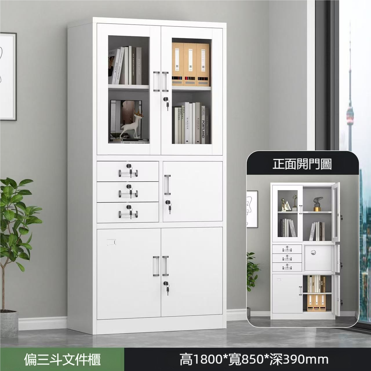櫃體尺寸為高1800mm、寬850mm、深390mm,適合存放各類文件、資料和其他辦公用品。