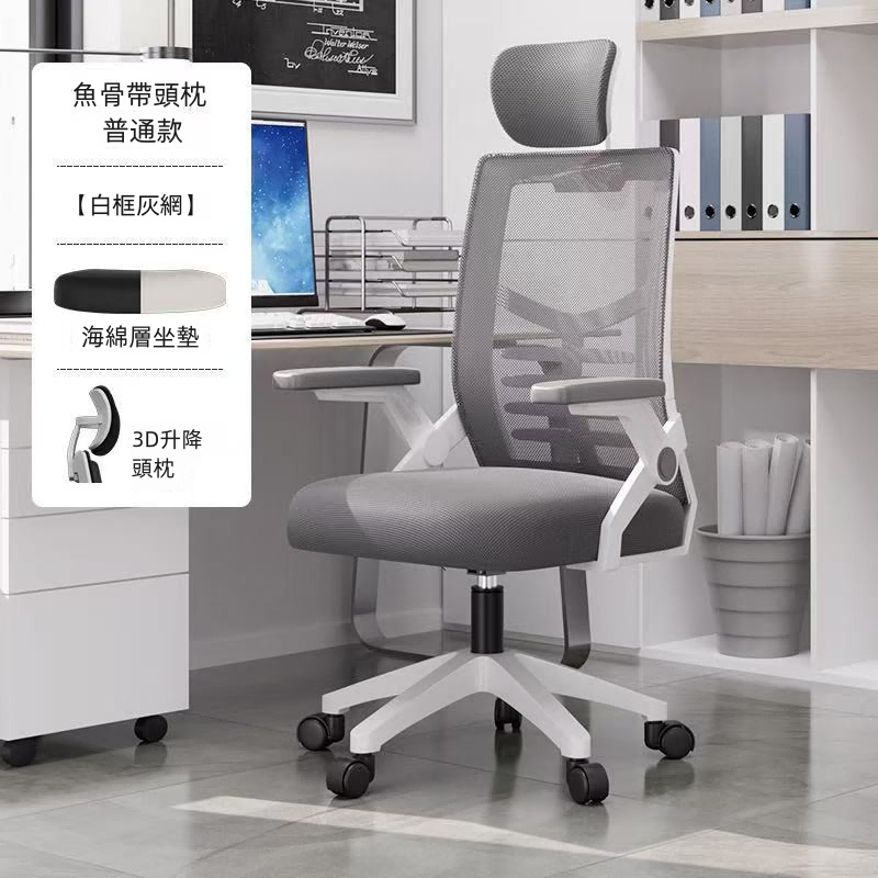 產品名稱 :白框灰網帶頭枕海綿坐墊普通款辦公椅子/電腦椅/會議室椅/職員椅