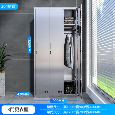 這款不鏽鋼三門健身房更衣櫃專為健身房、員工更衣室等場所設計,提供安全、耐用的存儲解決方案。高1800mm x 寬900mm x 深420mm 採用高品質304不鏽鋼製造,結構堅固,防銹耐腐蝕,適合高濕度環境使用。
