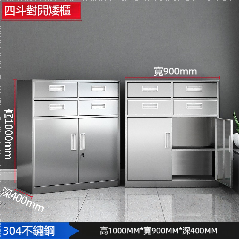 這款不鏽鋼四斗對開矮櫃專為現代辦公室設計,提供高效的檔案和文件存儲解決方案。其高1000mm、寬900mm、深400mm的尺寸,適合各種辦公環境。採用高品質304不鏽鋼材質,確保耐用性和穩定性。四斗設計方便分類存放,對開門設計則便於存取。